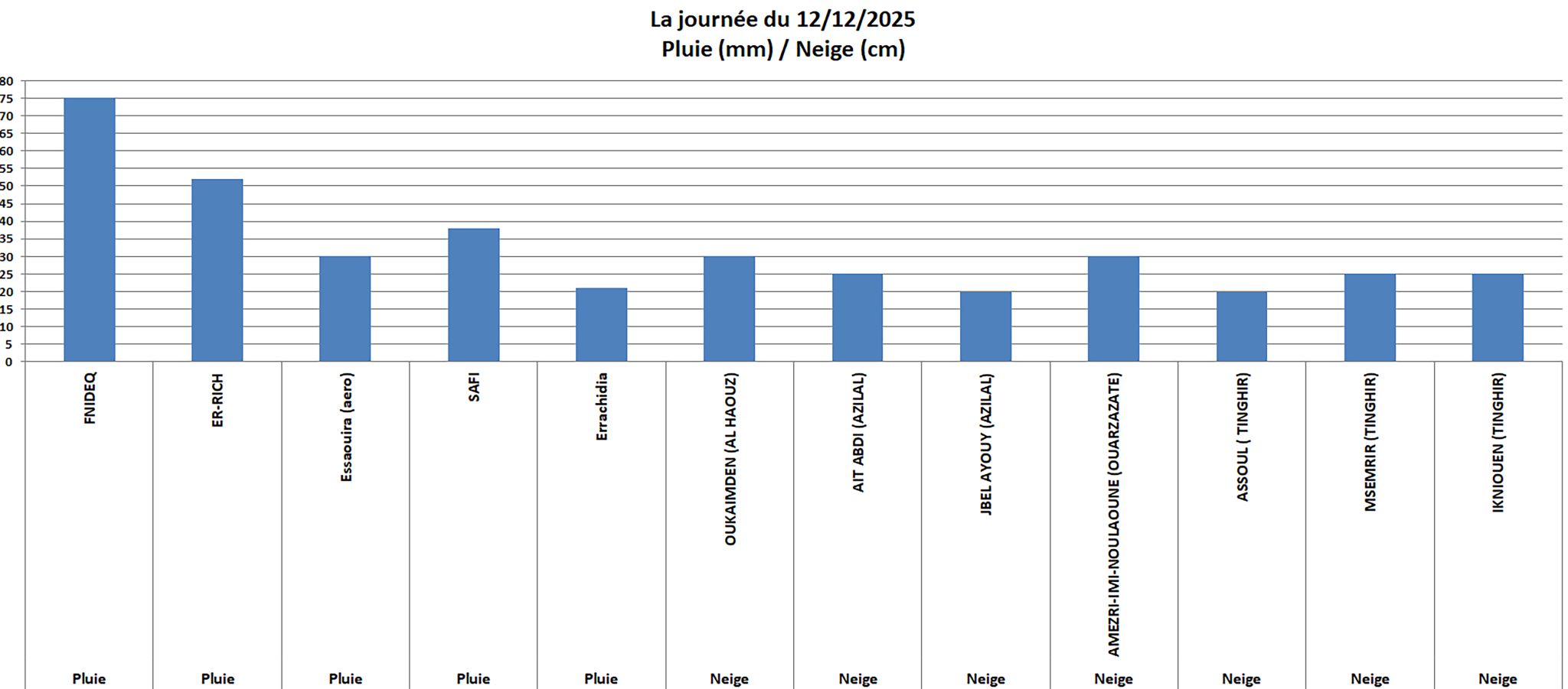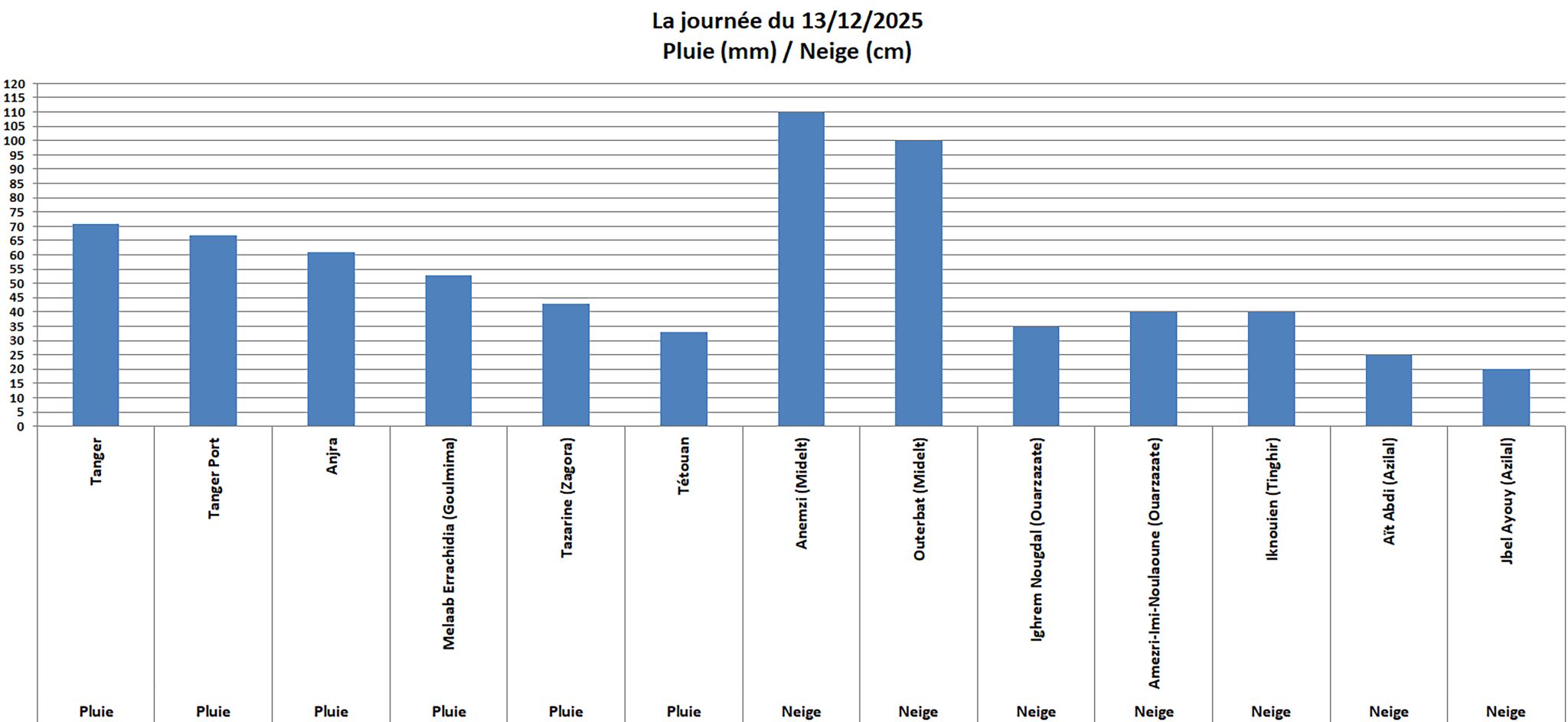 Plusieurs régions du Royaume ont enregistré des cumuls de pluie dépassant localement 70 mm en 24 heures, notamment sur l’extrême nord-ouest du pays. Les hauteurs de neige ont atteint près de 50 cm sur le Haut et le Moyen Atlas, avec des valeurs localement supérieures sur les sommets. - Épisodes localisés de fortes intensités